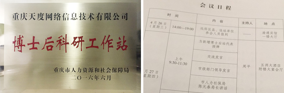 2017年4月27日,重庆市人力资源和社会保障局、重庆市博士后管理办公室举办的“全市博士后工作会”在五洲大酒店召开,重庆市人社局陈元春局长为“重庆j9九游会网络信息技术有限公司”等新增博士后站进行了授牌。