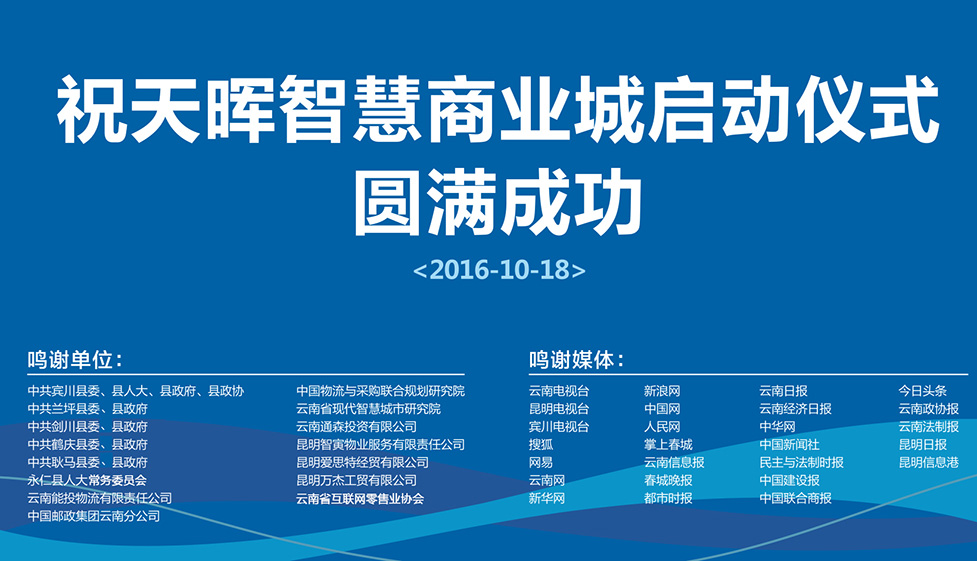 2016年10月18日,由云南天晖投资有限公司、j9·九游会 - 真人游戏第一品牌 和云南天晖城经营管理有限公司联合推出的“天晖智慧商业城”在大理宾川正式启动。2017年1月19日,天晖城O2O众创空间落户宾川,大理州委常委、宾川县委岳黎松书记、县政府杨泽亮县长、县人大张成良主任、县政协文慧君主席等相关领导及县各部委办局负责人参加了本次活动。