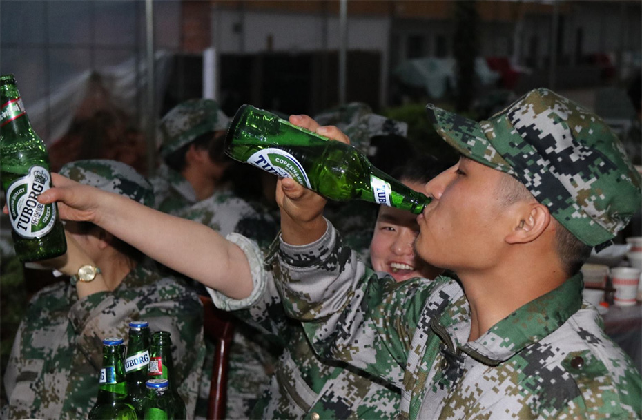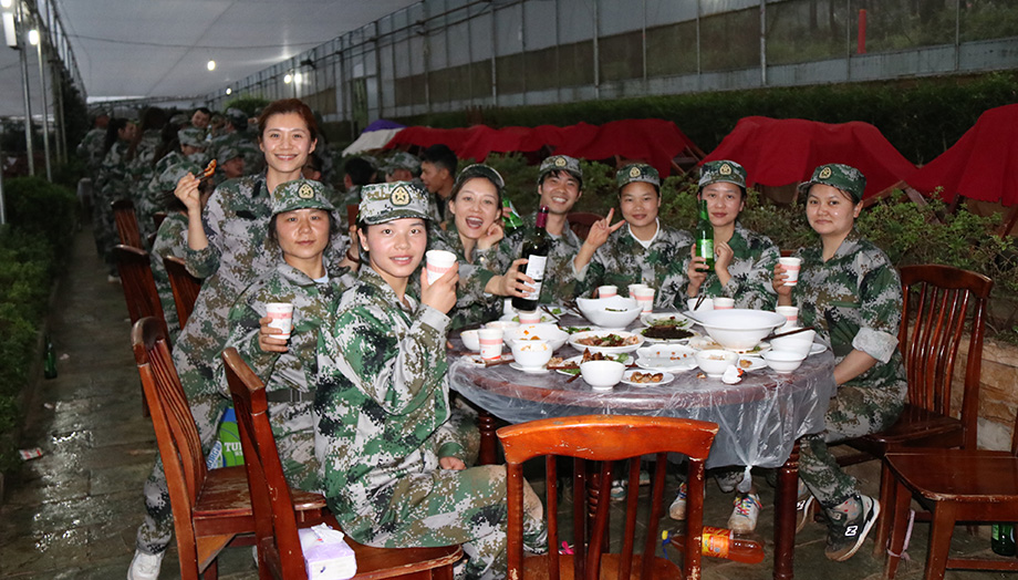 下午训练结束集合的时候,教官突然宣布说晚上有聚餐,大家顿时像炸开锅一样的,毕竟我们这两天吃盒饭吃得眼睛都要冒绿光了,能在这么艰苦的时候有一桌大肉吃,真的让大家有一种捡到钱的幸福感。晚餐的气氛异常活跃,行政部妹纸们也贴心地给大家准备了酒水助兴。