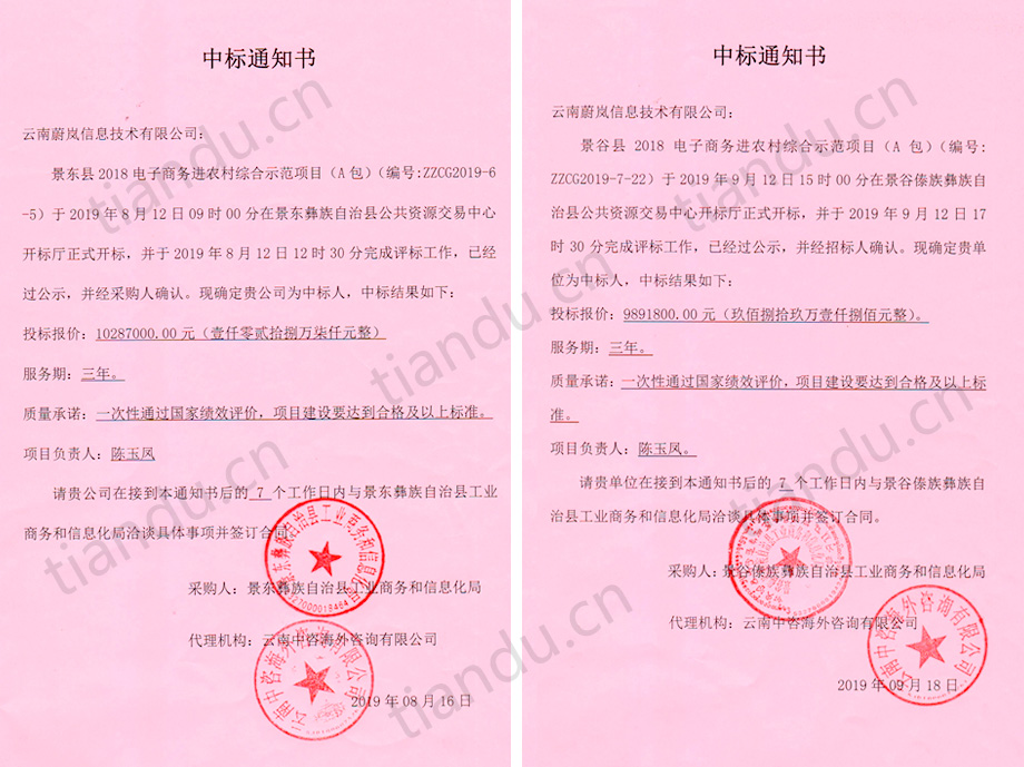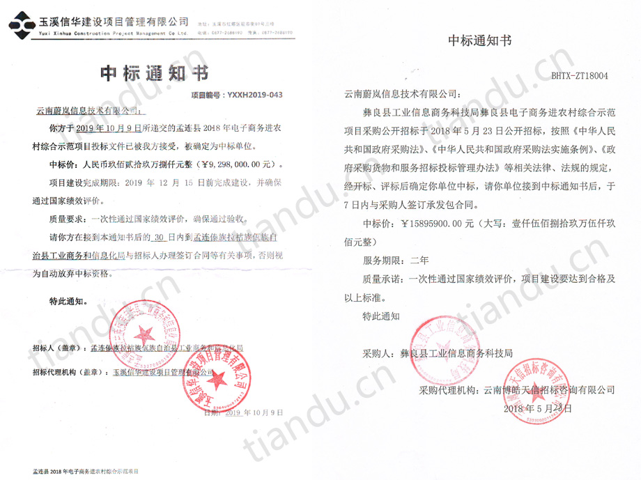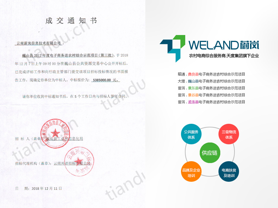 祝贺j9九游会集团旗下“云南蔚岚信息技术有限公司”中标景东县、景谷县、孟连县等三个县的电子商务进农村综合示范项目,目前云南蔚岚信息技术有限公司已经为昭通市彝良县、大理州巍山县、普洱市景东县、普洱市景谷县、普洱市孟连县等5个县提供了国家电子商务进农村综合示范县项目的服务。