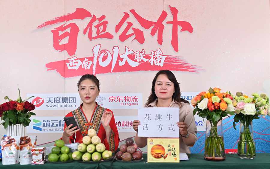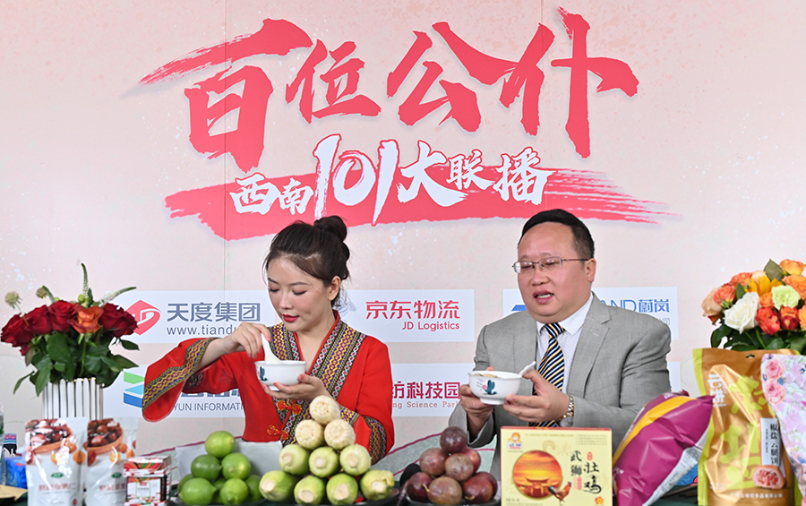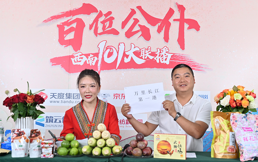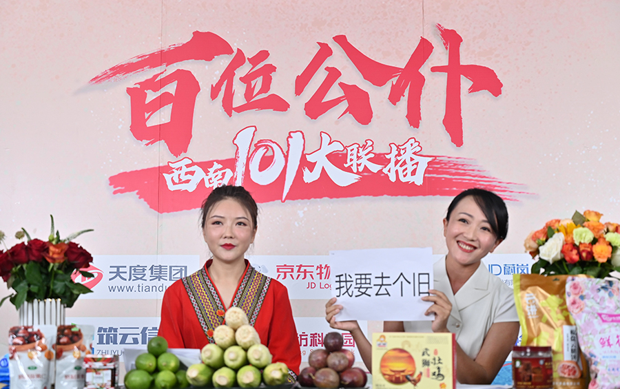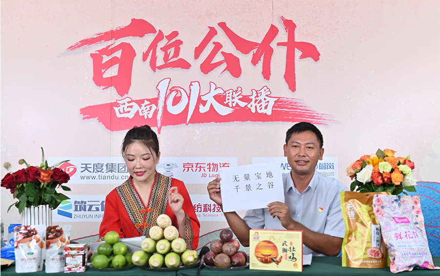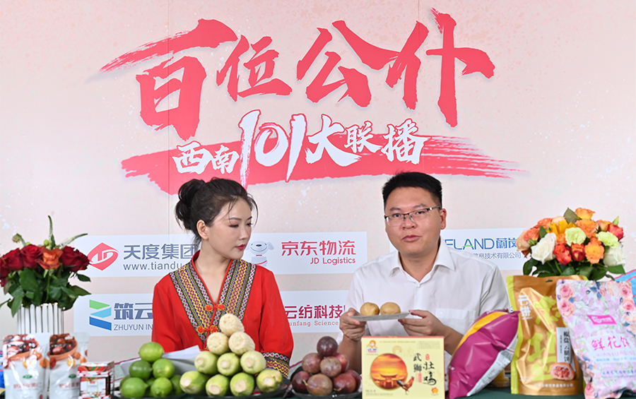 6月17日下午,“百位公仆,西南101大联播”大型助农直播活动在云纺科技园直播基地举行,来自云南巍山、南涧、水富、个旧、开远、彝良、武定、景东、景谷等县(市)的11位副县(市)长,与四川知名电视主持人、直播记者郭秀一同走进直播间,同框出镜,为云南各地好货代言,推动农产品推广上行,助力脱贫攻坚。近3小时的直播中,特色的农产品、实惠的价格,以及丰厚的赠品吸引了260多万网友围观。