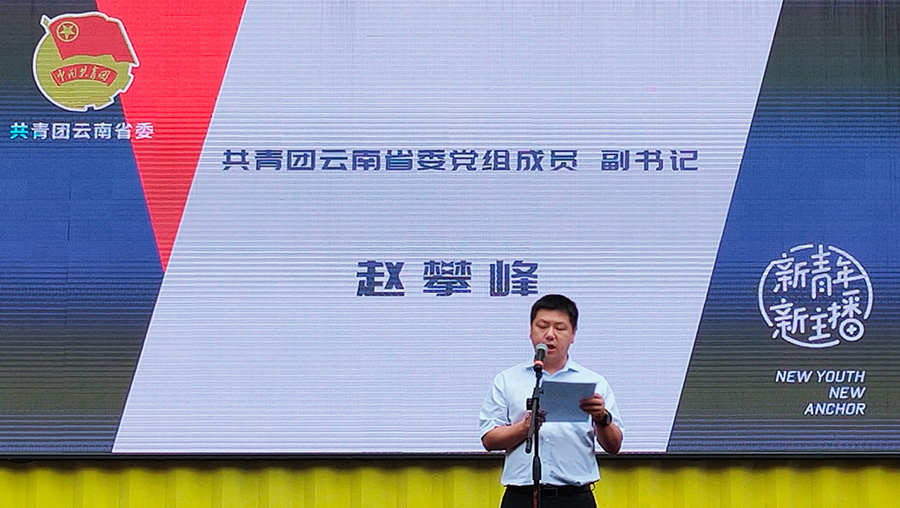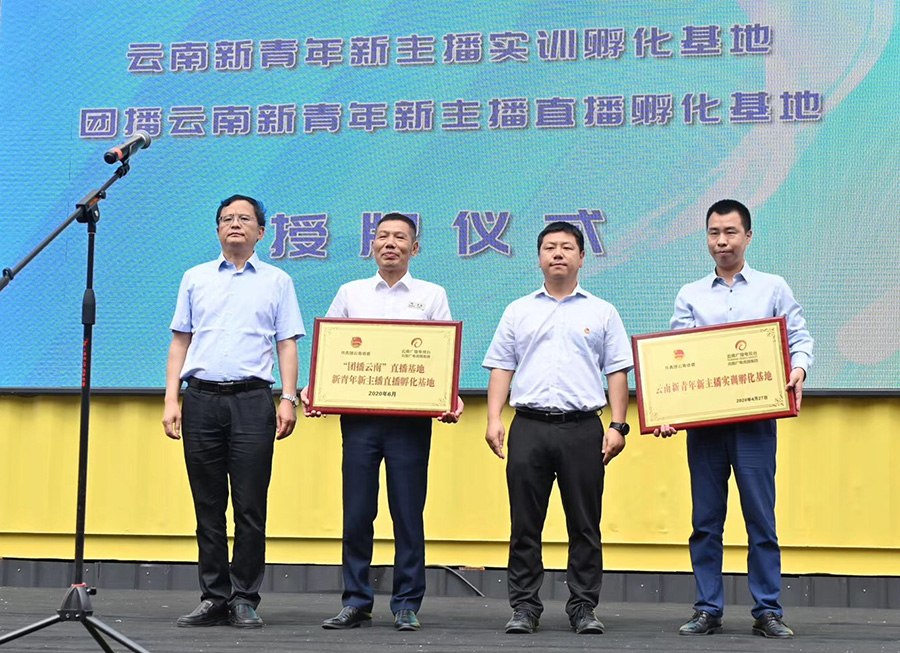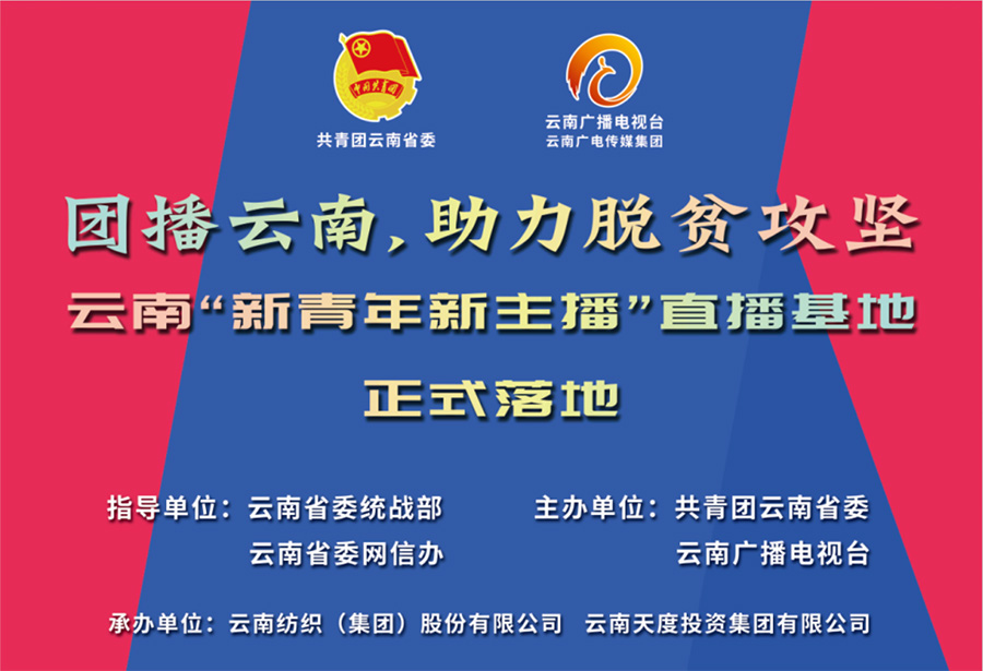 本次活动由共青团云南省委、云南广播电视台主办,在云南省委统战部新的社会阶层人士工作处、云南省委网信办社会工作处等相关部门领导及云纺集团、云南j9九游会集团、云南蔚岚电子商务、抖音昆明城市经理等相关企业及平台负责人、MCN机构、50多名青年主播的共同见证下,“团播云南”直播基地、云南新青年新主播直播基地正式开播。