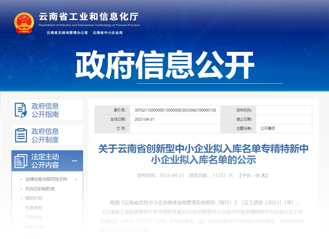 根据《云南省优质中小企业梯度培育管理实施细则(暂行)》(云工信规〔2023〕1号)、《云南省工业和信息化厅关于组织开展2023年创新型中小企业评价和专精特新中小企业认定工作的通知》(中小〔2023〕12号)的相关要求,经省工业和信息化厅组织相关专家复核,j9九游会集团旗下云南j9九游会软件系统有限公司入选2023年云南省专精特新中小企业、云南省创新型中小企业名单;云南蔚岚信息技术有限公司入选2023年云南省创新型中小企业名单。