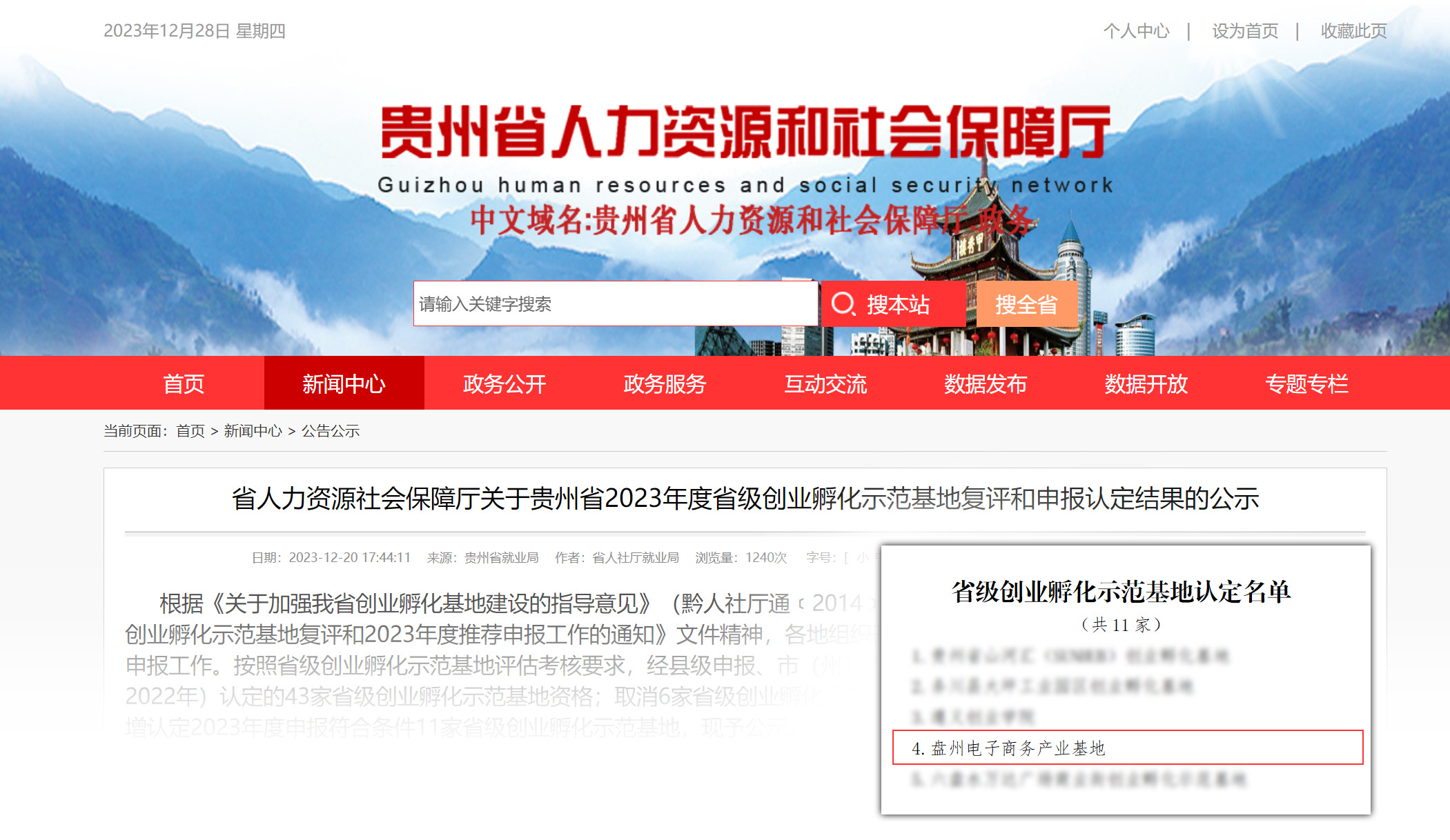 根据《关于加强我省创业孵化基地建设的指导意见》(黔人社厅通﹝2014﹞250号)和《省人力资源社会保障厅关于开展省级创业孵化示范基地复评和2023年度推荐申报工作的通知》文件有关规定,经基地申报,县级申报、市(州)初审、省级评估等程序,j9九游会集团盘州蔚岚电子商务有限公司建设运营的“盘州电子商务产业基地”获得贵州省人力资源和社会保障厅“省级创业孵化示范基地”认定。